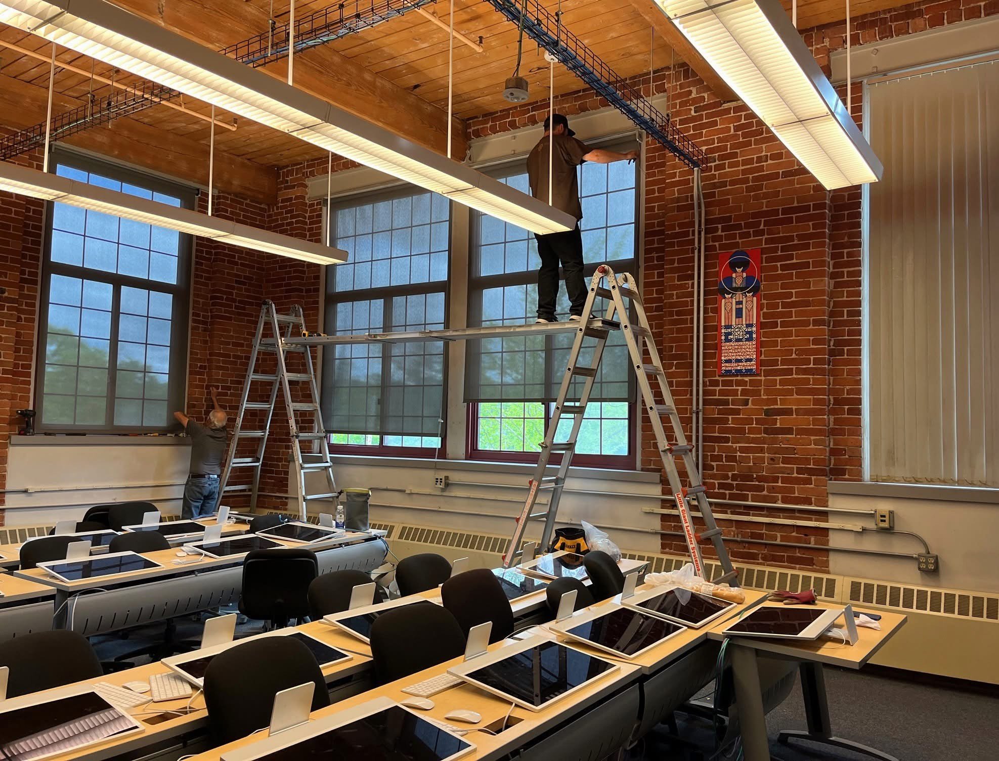 Whether it’s reupholstering worn and outdated furniture or designing window treatments for your commercial space, our team will help you choose the fabric, styles, and patterns that will give your commercial space a custom, unique look. We specialize in solving privacy and light control within offices or educational environments. Glare on computer screens has been a common recurring challenge that we have been able to successfully overcome. Below are photos from a hotel restaurant, a spa, and a university.